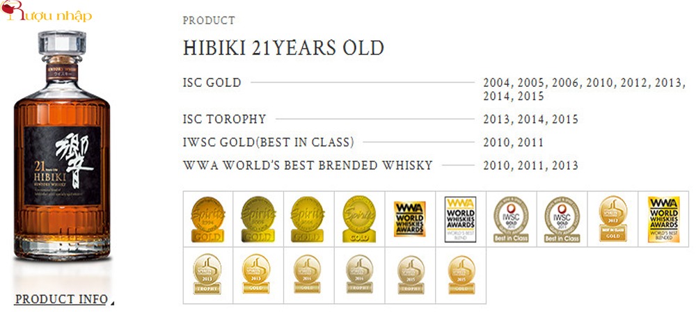 Rượu Hibiki 21 năm là một trong những thương hiệu đoạt khá nhiều giải thưởng tại các cuộc thi rượu quốc tế hàng năm.