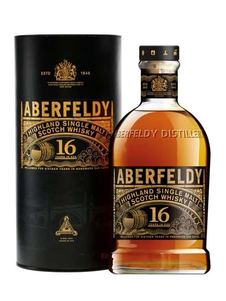 Rượu whisky single malt Aberfeldy 16 năm vùng Highland, Scotland. Rượu được ủ bourbon và thùng sherry cask, được phát hành năm 2015.