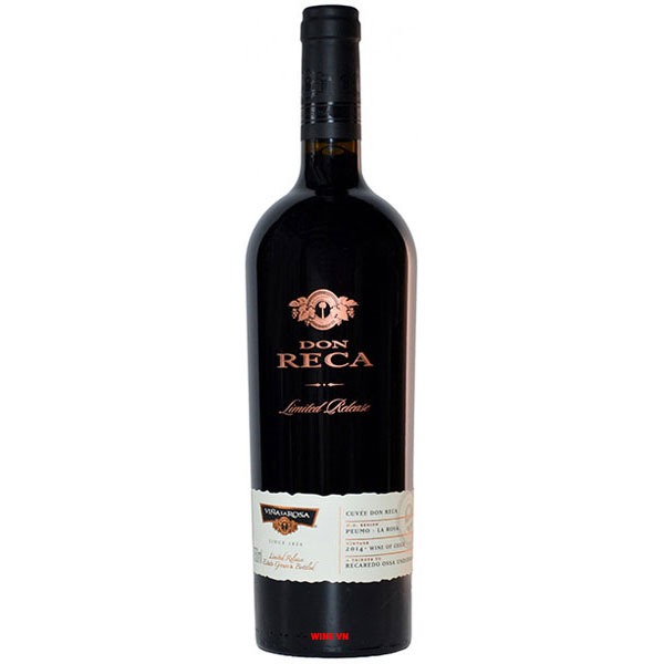 Tự hào là một trong số những chai rượu vang đỏ thuộc phiên bản giới hạn của thương hiệu sản xuất rượu vang nổi tiếng Chile là Vina La Rosa, rượu vang Don Reca Limited luôn được khách hàng trên toàn thế giới “săn đón”. Rượu được làm từ ba giống nho cơ bản là Cabernet Sauvignon, Merlot và Carmenere với nồng độ 14,5%.