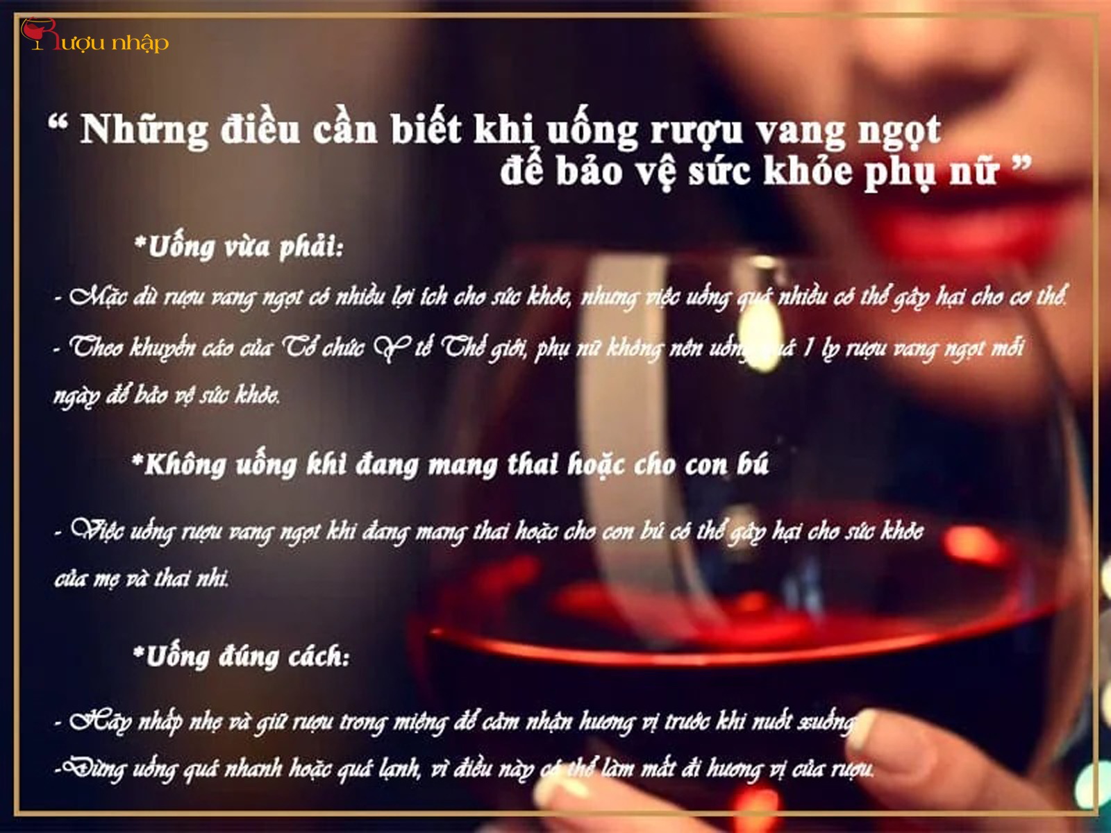 Để tận hưởng hương vị tuyệt vời của rượu vang ngọt và bảo vệ sức khỏe, phụ nữ nên uống rượu vang ngọt đúng cách. Hãy nhấp nhẹ và giữ rượu trong miệng để cảm nhận hương vị trước khi nuốt xuống. Đừng uống quá nhanh hoặc quá lạnh, vì điều này có thể làm mất đi hương vị của rượu.