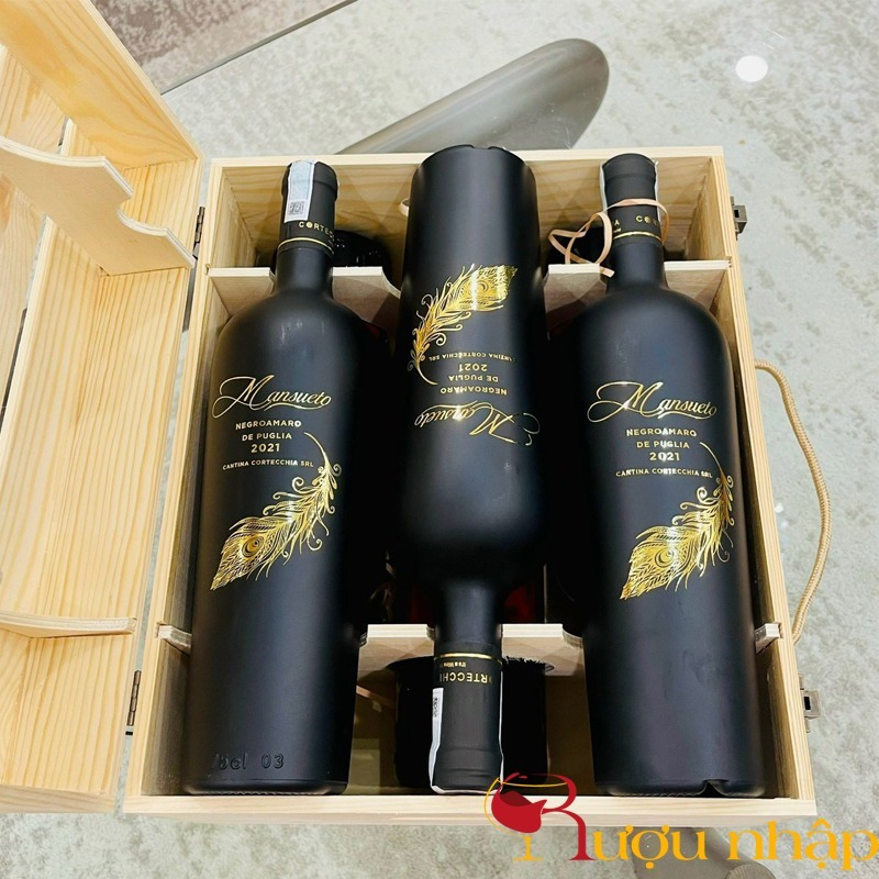Rươu Vang Ý Mansueto Negroamro – Lông phượng có nhãn chai và hình thức in rất sang trong, được phủ màu đen thân chai và hình ảnh, tên sản phẩm màu vàng 18k rất đẹp, phù hợp biếu tặng trong các dịp lễ tết với hộp quà sang trọng bậc nhất là một trong những lựa chọn tốt nhất cho khách hàng.