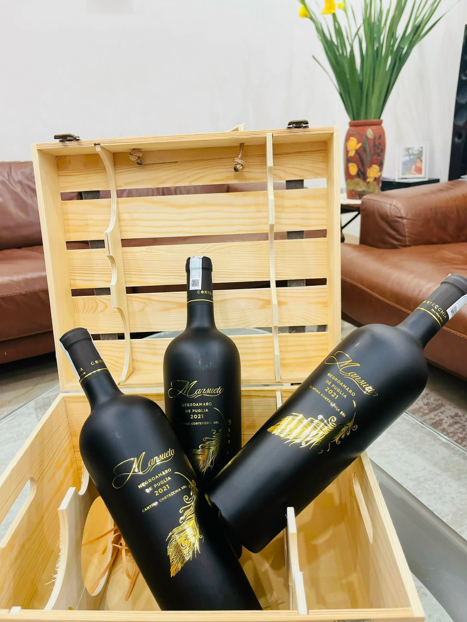 Toàn bộ thông tin cũng như hình ảnh trên thân chai được in trực tiếp lên bề mặt thủy tinh tvới tone màu vàng gold sáng bóng lấp lánh mang đậm tính sang trọng của một dòng rượu cao cấp. Sự kết hợp của hai giống nho Negroamaro và Sangiovese hứa hẹn sẽ làm hài lòng ngay cả những thực khách khó tính nhất.