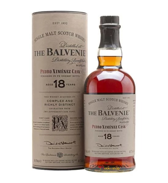 Hoàn thiện trong thùng sherry Pedro Ximenez, Balvenie 18 năm có sắc vàng óng ánh, hương nho khô, trái cây chua thanh và chút đinh hương. Vị rượu đậm đà nhưng mượt mà, hậu vị ngọt dịu của mật ong và nho khô kéo dài.